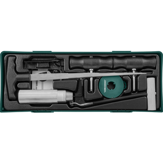 - **Описание** Комплект для демонтажа лобовых стекол, ложемент 370х140 мм. **Область применения** Набор инструмента предназначен для установки и демонтажа лобовых стекол автомобилей. Струна для срезки клея в местах соединения стекла с кузовом автомобиля Рукоятки для струны (2 шт.) Инструмент для срезки бутилового клея вокруг стекла Шило для установки струны; Клипсосъемник Инструмент для демонтажа молдингов