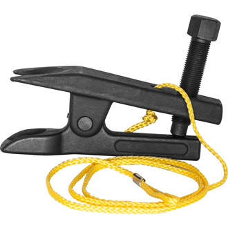 - **Описание** Съемник шарнирных соединений рычажный. Диаметр шейки демонтируемого пальца шарнира 18 мм. Страховочный шнур, входящий в комплект изделия, закрепленный на неподвижных элементах подвески или кузова автомобиля, предотвращает падение съемника при разъединении деталей узла. Для защиты от агрессивных воздействий на детали съемника используется фосфатирование. **Область применения** Съемник шарнирных соединений предназначен для проведения работ по обслуживанию узлов, имеющих в своей конструкции шаровые шарнирные соединения. Изделие комплектуется страховочным шнуром для фиксации съемника в рабочей области демонтажа шарнирных соединений.