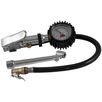 - **Описание** Манометр для контроля давления и подкачки шин с насадкой-удлинителем для г/а. Изделие имеет армированный воздушный шланг длиной 300 мм с разъемом, обеспечивающим быстрое и плотное соединение колесных вентилей пневматических шин с внешней резьбовой частью V8 (СпВ8). Два положения рукоятки управляют функциями инструмента: полностью нажата – подкачка, отпущена – замер давления. Сброс избыточного давления осуществляется при помощи кнопки, расположенной на корпусе пистолета. Дополнительно изделие комплектуется стальным трубчатым удлинителем для обслуживания внутренних колес шинных пар грузовых автомобилей. **Область применения** Устройство для контроля давления, сброса и подкачки применяется для обслуживания пневматических шин колесных транспортных средств, строительной и сельскохозяйственной техники в диапазоне рабочего давления от 0 до 14 bar. Изделие укомплектовано аналоговым стрелочным манометром диаметром 50 мм. Двушкальная градуировка позволяет контролировать значение в величинах PSI (внешняя шкала) или BAR (внутренняя шкала). Манометр снабжен резинополимерным протектором, предотвращающим повреждение прибора при неосторожном обращении. **Технические характеристики** | Рабочее давление, bar | 0-14 | | --- | --- | | Рабочее давление, bar | 0-14 | | --- | --- | | Длина шланга, мм | 300 | | Диаметр циферблата, мм | 50 | | Вес, кг | 0,584 | Манометр для шин 3-х функциональный Удлинитель для внутренних колес г/а Краткая инструкция на русском языке Гарантийный талон