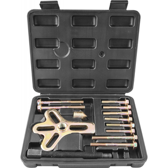 - **Описание** Универсальный съемник, в котором в качестве захватов используются болты. Диапазон захвата 30-120 мм. **Область применения** Данный инструмент применяется для обслуживания слабо, или умеренно нагруженных соединений (рулевые колеса, эластичные муфты и т.д.), в случаях, когда в демонтируемой детали имеются отверстия, или отверстия, позволяющие пропустить через них болты с другой стороны. **Схема применения** **** Траверса большая для диапазона 30-120 мм Ходовой винт, 125 мм Болты, резьба 1/4"x50мм., 3 шт. Болты, резьба 1/4"x75мм., 2 шт. Болты, резьба 5/16"x50 мм., 3 шт. Болты, резьба 5/16"x100 мм., 2 шт. Опоры ходового винта, 1 шт. Пластиковый кейс