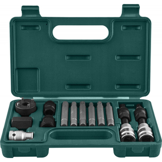 - **Описание** Набор съемников генераторов л/а. **Область применения** Набор инструментов, применяющихся для демонтажа ступичных резьбовых крепежных элементов шкивов генераторов автомобилей. Комбинированный инструмент с насадкой-битой L=110 мм 1/2"DR SPLINE M10 и специальной 33-гранной головкой для генераторов BOSCH Комбинированный инструмент с насадкой-битой L=110 мм 1/2"DR TORX T50 и специальной 33-гранной головкой для генераторов со свободным ходом шкива Вставки-биты TORX T40, T50 L=75 мм Вставки-биты HEX H8, H10 L=75 мм Вставки-биты SPLINE M8, M10 L=75 мм Специальная 33-гранная головка с приводом HEX 17 мм Специальная 33-гранная головка с приводом HEX 22 мм Втулка шестигранная 22 мм Насадка торцевая радиусная с 4 шипами и приводом 17 мм 1/2"DR держатель для бит HEX 10 мм Пластиковый кейс