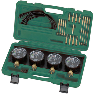 - **Описание** Синхронизатор карбюратора. Прибор, состоящий из четырех вакуумметров, установленных на пластине. **Область применения** Удобный инструмент, позволяющий производить настройку поликарбюраторных систем питания автомобилей, мотоциклов, лодочных моторов и многокамерных карбюраторов (Weber, Edelbrock, Holley). Четыре вакуумметра, установленные на пластине Соединительный шланг 8 х 5 х 950 мм – 4 шт. Удлинитель M5 х 0.8 х 169 мм – 4 шт. Удлинитель M5 х 0.75 х 53 мм – 4 шт. Удлинитель M5 х 0.8 х 100 мм – 4 шт. Адаптер 6 мм х 5 мм – 1 шт. Удлинитель M6 х 0.75 х 53 мм – 4 шт. Удлинитель M6 х 1.0 х 60 мм – 4 шт. Пластиковый кейс