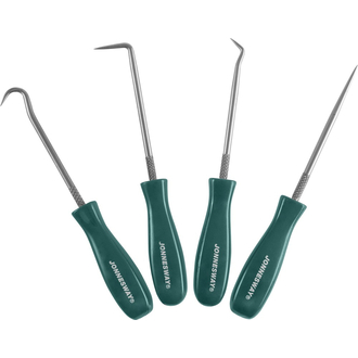 - **Описание** Набор крючков для демонтажа уплотнительных колец мини, 4 предмета. Инструменты изготовлены из нержавеющей стали. Рукоятки – ацетат. **Область применения** Изделия, входящие в состав набора применяются для демонтажа манжет, сальников и уплотнительных колец малых размеров узлов и агрегатов автомобильной техники, расположенных в труднодоступных местах. Шило прямое Шило 90° Шило 45° Крючок Зацеп универсальный Зацеп 90° укороченный