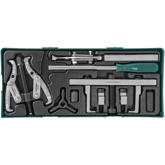- **Описание** Набор съемников и приспособлений для обслуживания приводных шкивов. Поставляется в удобном ложементе размером 430х180 мм, который легко помещается в тележку (Model: B) 1/3. **Область применения** Применяется для обслуживания приводных шкивов. **Способ применения**  Cъемник с двумя поворотными захватами, 100 мм Съемник шкивов со скользящими захватами Траверса для съемника с тремя поворотными захватами, 100 мм Съемник сальников