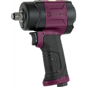 - **Описание** Гайковерт пневматический ударный композитный 1/2"DR 8500 об/мин., 1000 Нм компакт. Пневматический ударный гайковерт с лекгосплавным, металлическим корпусом ударного механизма, покрытым специальной, ударопрочной эмалью, нанесенной электростатическим способом. Корпус гайковерта выполнен из композитных материалов, который обеспечивает малый вес изделия, что в комплексе с резинополимерной накладкой рукоятки снижает вибрационные воздействия на руку оператора. Гайковерт применяется для обслуживания осложненных и нагруженных соединений с размерами резьбы до М16 и максимальным моментом затяжки 1000 Нм. Во время производства работ с применением пневматических ударных гайковертов, рекомендуется использование перчаток с виброгасящими накладками и средств защиты органов зрения и слуха. **Технические характеристики** | Присоединительный квадрат | 1/2"DR | | --- | --- | | Присоединительный квадрат | 1/2"DR | | --- | --- | | Частота свободного вращения | 8500 об/мин | | Максимальный крутящий момент | 1000 Нм | | Рабочий крутящий момент | 700 Нм | | Расход воздуха средний | 142 л/мин | | Диаметр воздушного шланга | 10 мм | | Штуцер подключения | 1/4"DR | | Габаритные размеры (ДхВхШ) | 179х132х65 мм | | Механизм привода | Двойной молот | | Масса изделия | 1.2 кг | **Область применения** Пневматические гайковерты THORVIK применяются для проведения слесарно-монтажных работ и работ, связанных с обслуживанием резьбовых соединений в мастерских, цехах и производственных помещениях, имеющих источник сжатого воздуха или компрессор, необходимой мощности и производительности с давлением не ниже 6 кг/см²., в температурном диапазоне от -20°С до +50°С, персоналом, имеющим соответствующую квалификацию, знакомым с правилами техники безопасности, условиями эксплуатации и навыками работы с пневмомеханическим инструментом.