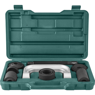 - **Описание** Съемник шарнирных соединений (4 в 1). Инструмент для снятия и установки соединений применяется при производстве работ по ремонту и обслуживанию автомобильной техники в качестве универсального приспособления. С помощью изделия, используя скобу и ходовой винт, легко демонтировать пальцы тормозных колодок барабанных тормозов тяжелых грузовых автомобилей или производить работы по замене крестовин карданных валов. **Область применения** Применяется при производстве работ по замене шаровых опор легковых автомобилей и внедорожников используется все изделия, входящие в комплект инструмента. Струбцина Ходовой винт Установочный адаптер (устанавливается в верхнюю часть струбцины и упирается в палец шарового шарнира) Приемные втулки, размерами: 50, 63, и 76 мм. (устанавливаются под рычаг при демонтаже шаровой опоры и на рычаг, при монтаже) Адаптер-толкатель (устанавливается на втулку ходового винта) Установочный адаптер «глухой» Дополнительная приемная втулка (устанавливается на втулку ходового винта без адаптера) Дополнительная приемная втулка L= 90 мм. (устанавливается на втулку ходового винта без адаптера)