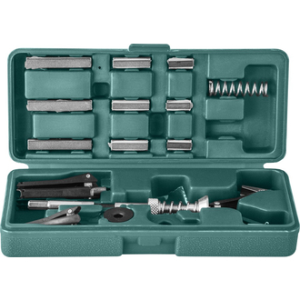 - **Описание** Набор хонов для цилиндров (18-89мм). Для удобства хранения набор помещен в оригинальный пластиковый кейс. **Область применения** Приспособление применяется в сочетании с механизированным инструментом для ремонта поврежденных рабочих поверхностей (зеркал) гидравлических цилиндров тормозных механизмов, плунжерных пар гидравлических насосов и т.п. в диапазоне размеров диаметров от 18 мм до 89 мм. Привод Запасная пружина Трехлапая насадка малая Трехлапая насадка большая Двулапая насадка (установлена на приводе) Набор установочных шплинтов Шлифовальные бруски L=19 мм, 3 шт. Шлифовальные бруски L=28,8 мм, 6 шт. Шлифовальные бруски L=51 мм, 3 шт.