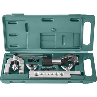 - **Описание** Набор для развальцовки трубок. Инструменты позволяют обрезать и развальцовывать трубки, изготовленные из меди, алюминия или мягких сортов стали, для соединений со стандартной и усиленной, двойной развальцовкой. Для удобства, детали, входящие в состав набора, хранятся в оригинальном пластиковом кейсе. **Область применения** Набор включает в себя перечень инструментов, применяющихся для изготовления элементов гидравлических магистралей автомобиля: систем питания, смазки, кондиционирования, тормозной системы и гидропривода сцепления. Труборез роликовый, усиленный с резаком для удаления заусенцев и запасным роликом Зажим для фиксации трубок диаметрами: 4, 4.75, 6, 8, 10, 12, 14 мм Пуансоны («грибки») для двойной развальцовки трубок диаметрами: 4, 4.75, 6, 8, 10 мм Станок для развальцовки Пластиковый кейс
