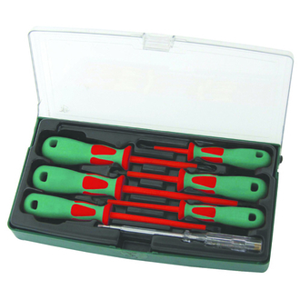 - **Описание** Набор отверток стержневых диэлектрических из 7 предметов. Изолирующие рукоятки обеспечивают защиту оператора от поражения электрическим током согласно всем требованиям стандарта VDE, соответствующего IEC 60900, полностью отвечают требованиям ГОСТ 21010-75. **Область применения** Стержневые диэлектрические отвертки применяются для производства работ с электрооборудованием, находящимся под напряжением до 1000 В. Отвертки шлицевые, SL, 3 шт.: SL4х100, SL5.5х125, SL6.5х150 Отвертки крестовые, PH, 3 шт.: PH0х60, PH1х80, PH2х100, PH0х60 Отвертка тестер 220- 250V Пластиковый бокс