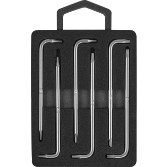 - **Описание** Согнутый под углом 90° стержень с рабочими профилями одного размера на обоих концах, сочетает в себе относительное удобство использования с возможностью приложения значительных рабочих нагрузок, когда в качестве ручки используется длинная часть и работу в труднодоступных местах, когда в качестве воротка используется короткая. Комплект угловых шестигранников "H09MT06S" изготовлен из стали S2, имеет матовое хромоникелевое покрытие. **Область применения** Применяется со всеми видами крепежа, имеющего внутренний рабочий профиль TORX TAMPER RESISTANT, с центровочным предохранительным штифтом. T4TR, T5TR, T6TR, T7TR, T8TR, T9TR Держатель