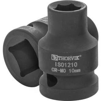 - **Описание** Головка торцевая ударная 1/2"DR, 10 мм. Торцевые головки Thorvik изготовлены с применением технологий, позволяющих передавать усилия, превышающие расчетные по современным стандартам на 30%. Широкий диапазон размеров, типов и профилей, высокая точность обработки, качественная хромомолибденовая сталь (Cr-Mo) и устойчивое фосфатированное покрытие делают инструмент надежным и долговечным. Торцевые головки Thorvik являются основной для создания систем сборного слесарно-монтажного инструмента. Имеет отверстие для фиксирующего штифта и выточка для уплотнительного кольца. **Область применения** Служит для начального откручивания крепежных деталей с 6-гранным рабочим профилем. Позволяет прилагать максимально допустимые для торцевых головок рабочие нагрузки. К минусам можно отнести сложность с позиционированием на крепеже, что при наличии трещоточной рукоятки не имеет значения. **Размеры** **** | Артикул | Размер | D2, мм | D1, мм | T, мм | L, мм | Вес, кг | | --- | --- | --- | --- | --- | --- | --- | | Артикул | Размер | D2, мм | D1, мм | T, мм | L, мм | Вес, кг | | --- | --- | --- | --- | --- | --- | --- | | ISO1210 | 10 | 25 | 16 | 12 | 38 | 0,067 |