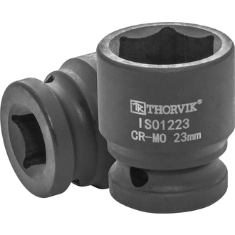 - **Описание** Головка торцевая ударная 1/2"DR, 23 мм. Торцевые головки Thorvik изготовлены с применением технологий, позволяющих передавать усилия, превышающие расчетные по современным стандартам на 30%. Широкий диапазон размеров, типов и профилей, высокая точность обработки, качественная хромомолибденовая сталь (Cr-Mo) и устойчивое фосфатированное покрытие делают инструмент надежным и долговечным. Торцевые головки Thorvik являются основной для создания систем сборного слесарно-монтажного инструмента. Имеет отверстие для фиксирующего штифта и выточка для уплотнительного кольца. **Область применения** Служит для начального откручивания крепежных деталей с 6-гранным рабочим профилем. Позволяет прилагать максимально допустимые для торцевых головок рабочие нагрузки. К минусам можно отнести сложность с позиционированием на крепеже, что при наличии трещоточной рукоятки не имеет значения. **Размеры** **** | Артикул | Размер | D2, мм | D1, мм | T, мм | L, мм | Вес, кг | | --- | --- | --- | --- | --- | --- | --- | | Артикул | Размер | D2, мм | D1, мм | T, мм | L, мм | Вес, кг | | --- | --- | --- | --- | --- | --- | --- | | ISO1223 | 23 | 30 | 34 | 18 | 38 | 0,142 |