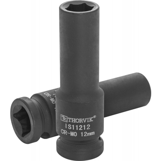 - **Описание** Головка торцевая ударная глубокая 1/2"DR, 12 мм. Торцевые головки Thorvik изготовлены с применением технологий, позволяющих передавать усилия, превышающие расчетные по современным стандартам на 30%. Широкий диапазон размеров, типов и профилей, высокая точность обработки, качественная хромомолибденовая сталь (Cr-Mo) и устойчивое фосфатированное покрытие делают инструмент надежным и долговечным. Торцевые головки Thorvik являются основной для создания систем сборного слесарно-монтажного инструмента. Имеет отверстие для фиксирующего штифта и выточка для уплотнительного кольца. **Область применения** Служит для начального откручивания крепежных деталей с 6-гранным рабочим профилем. Позволяет прилагать максимально допустимые для торцевых головок рабочие нагрузки. К минусам можно отнести сложность с позиционированием на крепеже, что при наличии трещоточной рукоятки не имеет значения. **Размеры**  | Артикул | Размер | D2, мм | D1, мм | T, мм | L, мм | Вес, кг | | --- | --- | --- | --- | --- | --- | --- | | Артикул | Размер | D2, мм | D1, мм | T, мм | L, мм | Вес, кг | | --- | --- | --- | --- | --- | --- | --- | | IS11212 | 12 | 24 | 20 | 26 | 78 | 0,138 |