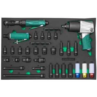 - **Описание** Набор пневматического инструмента 1/2"DR и аксессуаров к ударному инструменту в EVA ложементе 560х400 мм, 31 предмет. \[%48784%\] Гайковерт пневматический ударный 1/2"DR 8000 об/мин., 780 Нм \[%47111%\] Рукоятка трещоточная пневматическая 1/2"DR 170 об/мин., 100 Нм \[%47773%\] Бормашинка пневматическая 22000 об/мин., патрон 6 мм, L-146 мм Головки торцевые ударные 1/2"DR, 11 шт.: 10, 11, 12, 13, 14, 16, 17, 19, 21, 22, 24 мм Головки торцевые глубокие ударные 1/2"DR, 7 шт.: 10, 11, 13, 14, 17, 19, 21 мм Головки торцевые глубокие ударные для литых дисков 1/2"DR, 3 шт.: 17, 19, 21 мм Шарнир карданный для ударного инструмента 1/2"DR Удлинитель для ударного инструмента 1/2"DR, 75 мм Удлинитель для ударного инструмента 1/2"DR, 125 мм Удлинитель для ударного инструмента 1/2"DR, 250 мм Переходник для ударного инструмента 3/8”DR(F)x1/2”DR(M) Переходник для ударного инструмента 1/2”DR(F)x3/8”DR(M) Переходник для ударного инструмента 1/2”DR(F)x3/4”DR(M) Ложемент EVA 560х400 мм