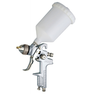 - **Описание** Пистолет покрасочный "Краскопульт" системы HVLP, бачок верхний нейлоновый 0.6 л, дюза 1.4 мм. Пневматические покрасочные пистолеты марки Jonnesway предназначены для проведения внутренних и наружных малярноотделочных работ различными типами лакокрасочных материалов с возможностью подключения к воздушной магистрали с давлением воздуха не ниже 6 атм. или компрессором, такой же мощности и производительностью не ниже 400 л/мин. **Область применения** Покрасочный пистолет системы HVLP пониженного рабочего давления и гравитационной подачей ЛКМ применяется для производства малярных работ со всеми типами лакокрасочных материалов, включая слабоадгезирующие и составы с высокой плотностью. Краскопульт комплектуется регулятором давления с контрольным манометром. **Технические характеристики** | Рабочее давление | 2 - 2,5 кгс/см2 | | --- | --- | | Рабочее давление | 2 - 2,5 кгс/см2 | | --- | --- | | Воздушный штуцер | 1/4" | | Штуцер резервуара | М16х1,5 мм | | Расход воздуха | 297 л/мин | | Вес | 0,7 кг | | Емкость резервуара | 0,6 л | | Материал резервуара | Нейлон | | Применяемые дюзы | 1,3; 1,5; 1,7; 2 | | Стандартная дюза | 1,4 мм | | Габаритные размеры | 170х325 мм | | Способ подачи ЛКМ | Гравитационный | | \*Возможность применения водорастворимых ЛКМ | Допускается конструкционно | **Изделие доступно к приобретению в виде набора.**