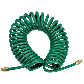 - **Описание** Шланг полиуретановый спиральный для пневматического инструмента 5х8 мм, 8 м. Спиральные шланги для пневмоинструмента Jonnesway изготовлены из армированного полиуретана. Изделия комплектуются штуцерами для подключения инструмента или фитинга с ответной резьбовой частью 1/4" BSP (NPT, с уплотнителем). **Область применения** Рассчитаны для применения при рабочем давлении 7 кгс/см² в температурном диапазоне от -20 до +70°С. Предельное давление «на разрыв» 28 кгс/см². Спиральные шланги не рекомендуются к применению при производстве малярных работ при боковом, к окрашиваемой поверхности, расположении подвода шланга.