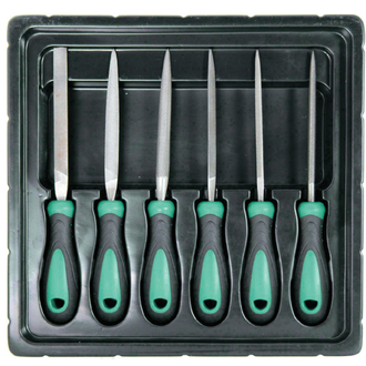 - **Описание** Набор надфилей 100 мм из 6 предметов, надфилей с бархатной насечкой, плотностью 28 зубьев на см. Твердость рабочей поверхности изделий 64-66 HRC. В наборе содержатся плоский, плоский пазовый, полукруглый пазовый, круглый, квадратный и треугольный зауженный надфили. Изделия снабжены резинополимерными рукоятками.