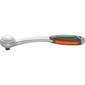 - Трещоточная рукоятка с изогнутой ручкой и дисковым переключателем направления вращения обеспечивает очень маленький 5° обратный ход благодаря конструкции храпового механизма. Изогнутая форма ручки позволяет использовать изделие при обслуживании заглубленного крепежа без опаски повреждения руки оператора. Трехкомпонентная резинополимерная рукоятка обеспечивает надежное удержание инструмента. К особенностям эксплуатации можно отнести необходимость достаточно частого обслуживания, чистых рук пользователя и свободной от загрязнений рабочей зоны. Применяются при производстве работ со слабонагруженными резьбовыми соединениями. Не имеют альтернативы (за исключением трещоточных ключей) при использовании в ограниченных рабочих пространствах.