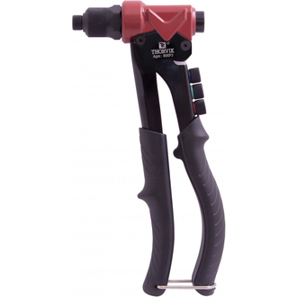 - **Описание** Ручной рычажный заклепочник **THORVIK®** предназначен для работы с резьбовыми и вытяжными заклепками с алюминиевыми и стальными сердечниками. В комплект поставки входят две просечки круглого и прямоугольного сечения для работы с листовым металлом. Заклепочник имеет алюминиевый корпус и рычаги, изготовленные из закаленной углеродистой стали.