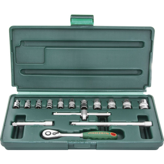 - **Описание** Набор головок торцевых 1/4"DR, 4-14 мм, 15 предметов. Основная разновидность рабочих насадок сборного слесарно-монтажного инструмента - это торцевая головка. Торцевые головки разделяются по геометрии рабочего профиля, по длине и по назначению. Такие инструменты обеспечивают наилучшие условия для приложения рабочего усилия по сравнению с другими видами инструмента для работы с внешними рабочими профилями. Торцевая головка выполнена из хромованадиевой стали, имеет накатку и полуматовое хромоникелевое покрытие. Изделие изготовлено по стандарту DIN 3124, полностью соответствует требованиям ГОСТа 25604-83. **Область применения** В данном наборе представлены торцевые головки с шестигранным рабочим профилем, который считается наилучшим с точки зрения приложения максимальных рабочих нагрузок, передаваемых крепежной детали. Система инструмента с присоединительным квадратом 1/4"DR является основной при работе с внешним рабочим профилем от 4 до 13 мм так как применение этой системы связано, в первую очередь, с обслуживанием изделий точной механики, электроники и бытовой техники, где рабочая зона ограничена и отсутствуют серьезные нагрузки. Так же применяется при производстве работ по обслуживанию автомобильной техники система незаменима для ремонта и установки малых агрегатов и навесного оборудования двигателей благодаря небольшим размерам. \[%48035%\] Головка торцевая 1/4"DR, 4 мм \[%47990%\] Головка торцевая 1/4"DR, 5 мм \[%47992%\] Головка торцевая 1/4"DR, 6 мм \[%47993%\] Головка торцевая 1/4"DR, 7 мм \[%47994%\] Головка торцевая 1/4"DR, 8 мм \[%47995%\] Головка торцевая 1/4"DR, 9 мм \[%47996%\] Головка торцевая 1/4"DR, 10 мм \[%47997%\] Головка торцевая 1/4"DR, 11 мм \[%47998%\] Головка торцевая 1/4"DR, 12 мм \[%47999%\] Головка торцевая 1/4"DR, 13 мм \[%48538%\] Головка торцевая 1/4"DR, 14 мм \[%47168%\] Рукоятка трещоточная, 135 мм \[%47389%\] Удлинитель 1/4"DR, 150 мм \[%46359%\] Удлинитель 1/4"DR, 75 мм \[%47286%\] Вороток Т-образный Пластиковый кейс