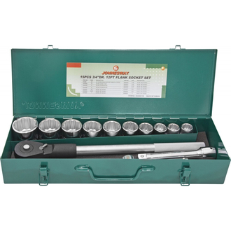 - Основная разновидность рабочих насадок сборного слесарно-монтажного инструмента - это торцевая головка. Торцевые головки разделяются по геометрии рабочего профиля, по длине и по назначению. Такие инструменты обеспечивают наилучшие условия для приложения рабочего усилия по сравнению с другими видами инструмента для работы с внешними рабочими профилями. Система инструмента с присоединительным квадратом _**3/4’’DR**_ применяется, прежде всего, при обслуживании тяжелой транспортной, строительной и сельскохозяйственной техники, то есть там, где размеры резьбовых деталей велики, а нагрузки порой экстремальны. В отличие от системы 1/2’’DR, эта система не может предложить большого разнообразия насадок, приводов и переходников, но при производстве работ с крепежом, размерами более 30 мм система _**3/4"DR**_ часто незаменима. Торцевые головки выполнены из хромованадиевой стали, накатка из-за невозможности кистевого воздействия на крепеж больших размеров отсутствует. Полуматовое хромоникелевое покрытие надежно защищает изделие от коррозии и механических повреждений. Содержание: Головки торцевые 12-ти гранные, 10 шт.: 7/8”, 15/16”, 1”, 1-1/8”, 1-1/4”, 1-7/16”, 1-1/2”, 1-5/8”, 1-3/4”, 2”; Рукоятка трещоточная, 500 мм.; Удлинители, 2 шт.: 100, 200 мм.; Вороток Т-образный 450 мм; Металлический кейс.