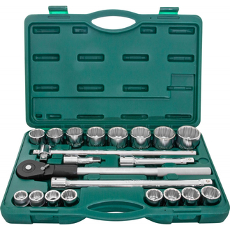 - Основная разновидность рабочих насадок сборного слесарно-монтажного инструмента - это торцевая головка. Торцевые головки разделяются по геометрии рабочего профиля, по длине и по назначению. Такие инструменты обеспечивают наилучшие условия для приложения рабочего усилия по сравнению с другими видами инструмента для работы с внешними рабочими профилями. Система инструмента с присоединительным квадратом _**3/4’’DR**_ применяется, прежде всего, при обслуживании тяжелой транспортной, строительной и сельскохозяйственной техники, то есть там, где размеры резьбовых деталей велики, а нагрузки порой экстремальны. В отличие от системы 1/2’’DR, эта система не может предложить большого разнообразия насадок, приводов и переходников, но при производстве работ с крепежом, размерами более 30 мм система _**3/4"DR**_ часто незаменима. Торцевые головки выполнены из хромованадиевой стали, накатка из-за невозможности кистевого воздействия на крепеж больших размеров отсутствует. Полуматовое хромоникелевое покрытие надежно защищает изделие от коррозии и механических повреждений. Содержание: 3/4"DR: Головки торцевые 12-ти гранные, 16 шт.: 7/8”, 15/16”, 1”, 1-1/16”, 1-1/8”, 1-3/16”, 1-1/4”, 1-5/16”, 1-3/8”, 1-7/16”, 1-1/2”, 1-5/8”, 1-3/4”, 1-13/16”, 1-7/8”, 2”; Рукоятка трещоточная, 500 мм.; Удлинители, 3 шт.: 100, 200 и 400 мм.; Вороток Т-образный 450 мм; Пластиковый кейс.