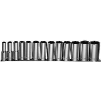 - **Описание** Набор головок торцевых глубоких MAXI-DRIVE 1/2"DR на держателе, 11-32 мм, 13 предметов. Основная разновидность рабочих насадок сборного слесарно-монтажного инструмента - это торцевая головка. Торцевые головки разделяются по геометрии рабочего профиля, по длине и по назначению. Такие инструменты обеспечивают наилучшие условия для приложения рабочего усилия по сравнению с другими видами инструмента для работы с внешними рабочими профилями. Торцевая головка выполнена из хромованадиевой стали, имеет хромоникелевое покрытие. Изделие изготовлено по стандарту DIN 3124, полностью соответствует требованиям ГОСТа 25604-83. **Область применения** В данном наборе представлены торцевые головки с шестигранным рабочим профилем, который считается наилучшим с точки зрения приложения максимальных рабочих нагрузок, передаваемых крепежной детали. Система инструмента с присоединительным квадратом 1/2"DR является сегодня самой универсальной, покрывая самый большой диапазон размеров от 8 до 36 мм. За её рамками находятся лишь несколько самых мелких размеров и размеры крепежа, применяемые в крупногабаритных конструкциях. Данная система самая «богатая» по количеству разнообразных насадок, вариантов переходников и приводов и поэтому инструмент с присоединительным квадратом 1/2"DR является основой, на которой строится вся система сборного слесарно-монтажного инструмента предприятия. Торцевые головки 1/2"DR позволяют прилагать рабочие нагрузки, которые только в состоянии выдержать резьбовые соединения. \[%47234%\] Головка торцевая глубокая, 1/2"DR, 11 мм \[%47236%\] Головка торцевая глубокая, 1/2"DR, 13 мм \[%47237%\] Головка торцевая глубокая, 1/2"DR, 14 мм \[%47238%\] Головка торцевая глубокая, 1/2"DR, 15 мм \[%47240%\] Головка торцевая глубокая, 1/2"DR, 17 мм \[%47242%\] Головка торцевая глубокая, 1/2"DR, 19 мм \[%47244%\] Головка торцевая глубокая, 1/2"DR, 21 мм \[%47245%\] Головка торцевая глубокая, 1/2"DR, 22 мм \[%47246%\] Головка торцевая глубокая, 1/2"DR, 23 мм \[%47247%\] Головка торцевая глубокая, 1/2"DR, 24 мм \[%47248%\] Головка торцевая глубокая, 1/2"DR, 27 мм \[%47250%\] Головка торцевая глубокая, 1/2"DR, 30 мм \[%47251%\] Головка торцевая глубокая, 1/2"DR, 32 мм Держатель "рельс"