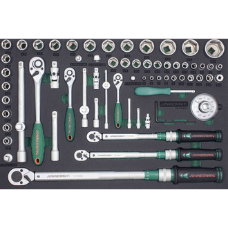 - Набор ключей динамометрических и головок торцевых с аксессуарами в EVA ложементе 560x400 мм 66 предметов Jonnesway®, включающий в себя головки торцевые с 6-гранным рабочим профилем, динамометрические ключи с диапазоном от 2 Нm до 200 Нm и комплектом аксессуаров. Набор предназначен для комплектования инструментальных тележек и тумб в слесарных мастерских и автосервисах. Головка торцевая 6-гр, 1/4"DR: 10 шт.; 5, 6, 7, 8, 9, 10, 11, 12, 13, 14 мм Рукоятка трещоточная 1/4"DR, 36 зубцов, 145 мм Удлинитель 1/4"DR, 50 мм Удлинитель 1/4"DR, 75 мм Удлинитель 1/4"DR, 150 мм Шарнир карданный 1/4"DR Рукоятка отверточная 1/4"DR Переходник 1/4"DR(F)\*3/8"DR(M) Переходник 3/8"(F) X 1/4"(M) Ключ динамометрический 1/4"DR, 2-10 Нм Головка торцевая 6-гранная, 1/4"DR,: 3/8"DR: 12 шт., 6, 7, 8, 10, 11, 12, 13, 14, 15, 16, 17, 19 мм Рукоятка трещоточная 3/8"DR, 36 зубцов, 185 мм Удлинители 3/8"DR: ., 2шт. 75,150 мм Шарнир карданный 3/8"DR Переходник 3-х сторонний 1/2"(F)-3/8"(М) Переходник 3/8"DR(F)\*1/2"DR(M) Переходник 3/8"DR(F)\*1/4"DR(M Ключ динамометрический 3/8"DR, 10-60 Нм Головка торцевая 1/2"DR 6-гранная, 19 шт.: 10, 11, 12, 13, 14, 15, 16, 17, 18, 19, 20, 21, 22, 23, 24, 27, 30, 32, 36 мм Рукоятка трещоточная 1/2"DR, 36 зубцов, 280 мм Удлинители 1/2"DR:., 2 шт. 125, 250 Шарнир карданный 1/2"DR Переходник 3-х сторонний 3/8"(F)х1/2"(M) Переходник 1/2"DR(F)\*3/8"DR(M) Ключ динамометрический 1/2"DR, 40-200 Нм Угломер