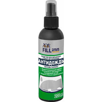 - **Описание** Антидождь FILL Inn безупречно очищает лобовое стекло от грязевых пятен и разводов и делает процесс вождения более безопасным. Создает на стекле защитную пленку. Дождь, снег и грязь не удерживаются на поверхности стекла и уносятся встречным потоком воздуха. При скорости 60 км/ч и выше стеклоочистители практически не нужны. Применение Антидождя FILL Inn продлевает срок службы щеток стеклоочистителя и предотвращает механический износ стекол. **Область применения** Применяется для обработки стекол автомобилей.