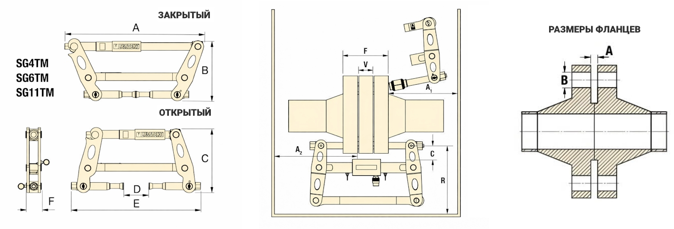 Параметры установки и зазоров серии SGМодель Толщина фланца F Толщина клапана / вставки V Зазор C Радиальное пространство R Осевое A1 Осевое A2 Мин Макс Измерено Мин Макс Измерено Макс Измерено Мин Измерено Мин Измерено SG4TM 60 185 Наружный торец фланца / Наружный торец фланца 0 45 Внутренний торец фланца / Внутренний торец фланца 50 Окружность болтовых отверстий / Наибольший Ø клапана 170 Окружность болтовых отверстий / Ближайшее препятствие 170 Наружный торец фланца / Ближайшее препятствие 200 Внутренний торец фланца / Ближайшее препятствие SG6TM 60 210 0 50 55 230 200 234 SG11TM 96 240 0 60 60 240 223 258 SG13TE 120 310 0 95 70 280 310 260 SG15TE 140 400 0 80 80 370 380 315 Применение разгонщиков фланцев LASTEKO